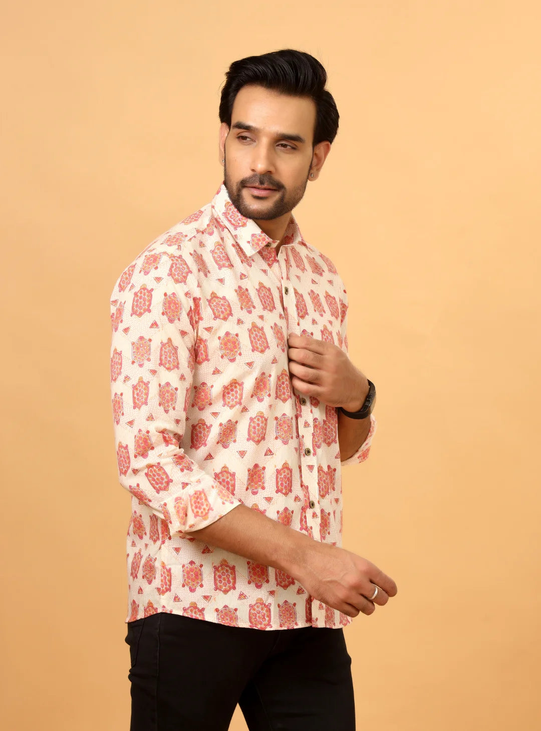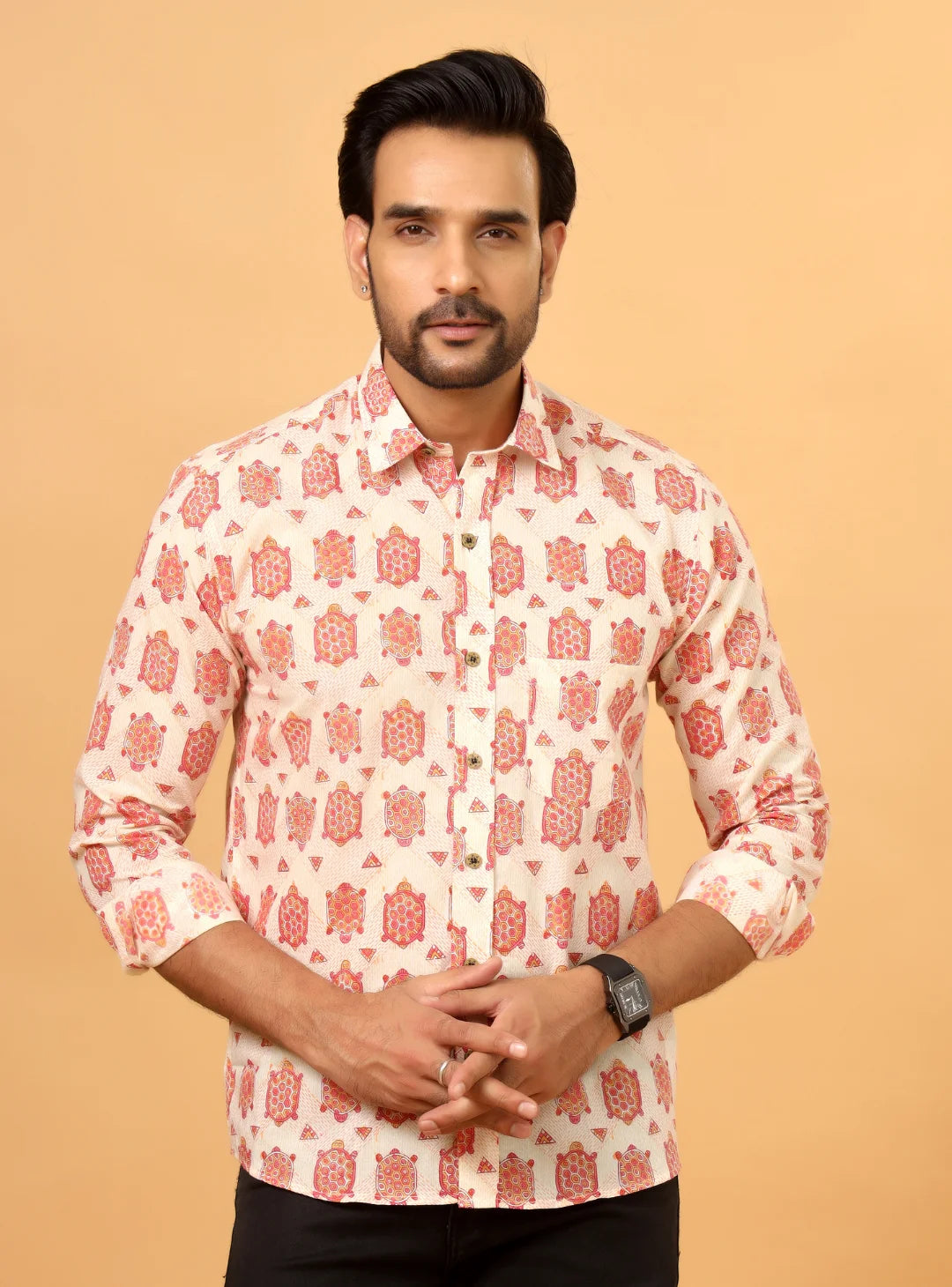 Men’s Cotton Shirt in Peach Leaf Pattern – Sanganeri Print
